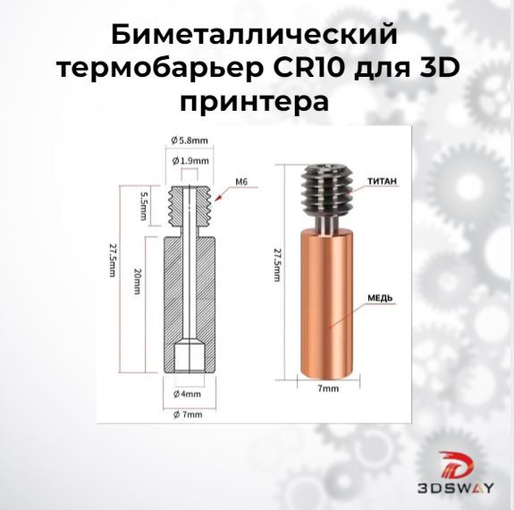 Биметаллический термобарьер CR10 — это важная запчасть для вашего 3D принтера, которая обеспечивает оптимальное функционирование хотенда. Этот продукт идеально подходит для моделей принтеров серии CR-10 и других совместимых устройств. Он сочетает в себе два различных материала, что позволяет эффективно справляться с высокими температурами в процессе печати.