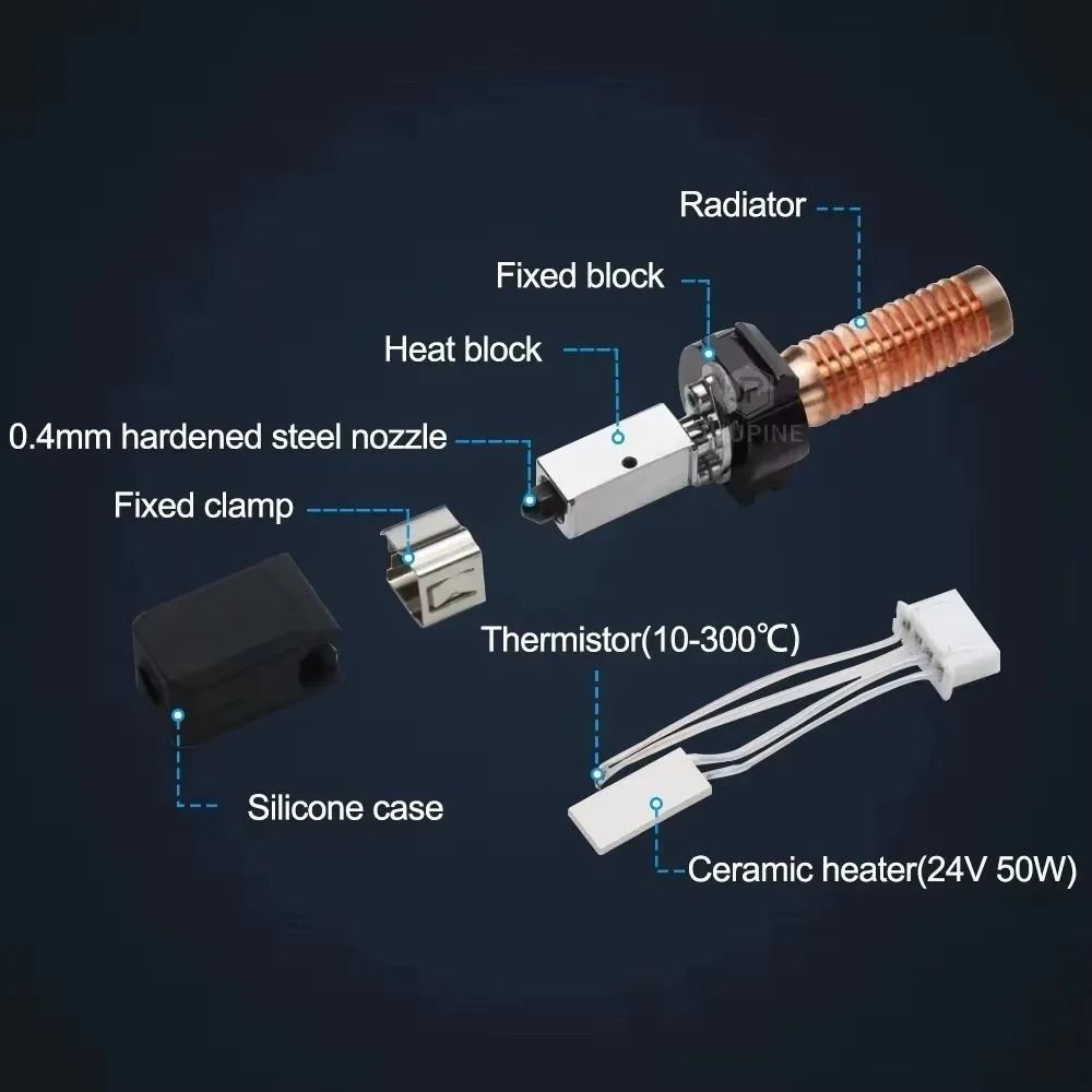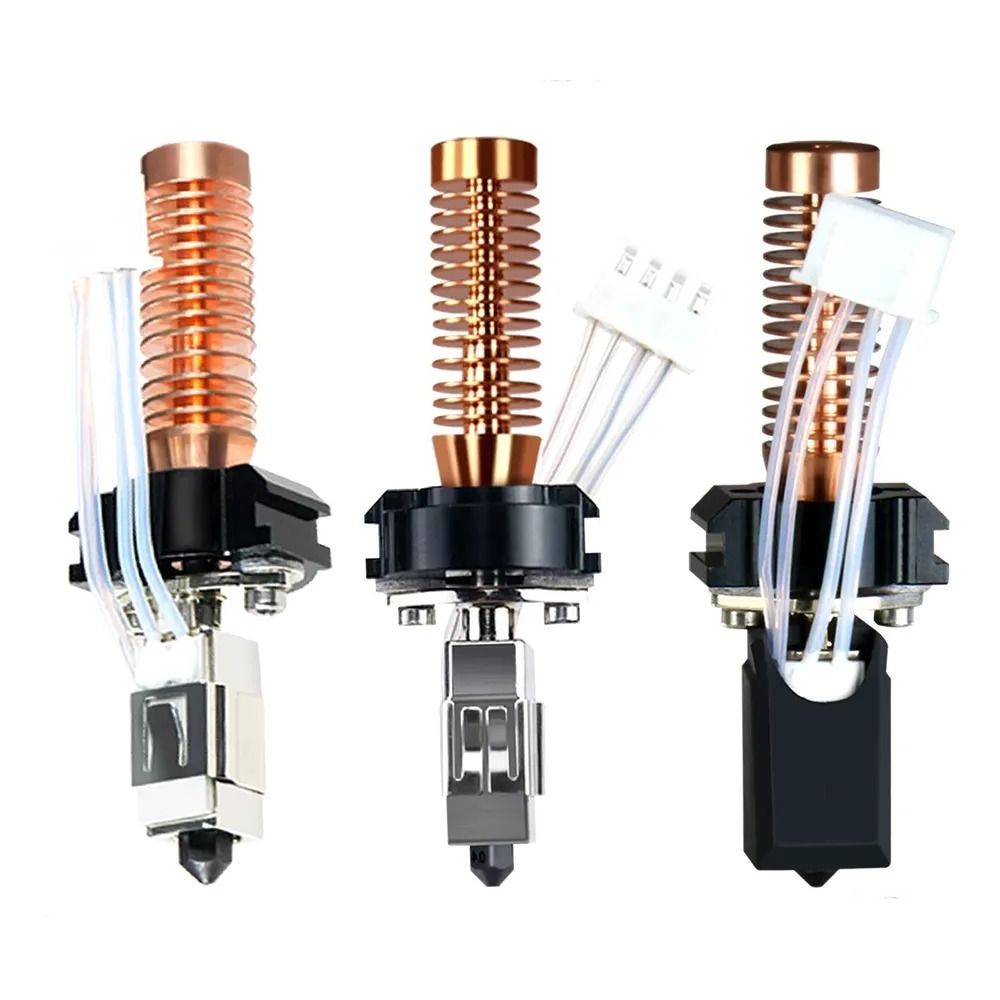 Эта модель хотэнда отличается высокой надежностью и долговечностью, что позволяет использовать ее в длительных эксплуатационных условиях. Сопла, входящие в комплект, обеспечивают равномерное распределение нагрева и точность экструзии, что значительно улучшает качество печати.