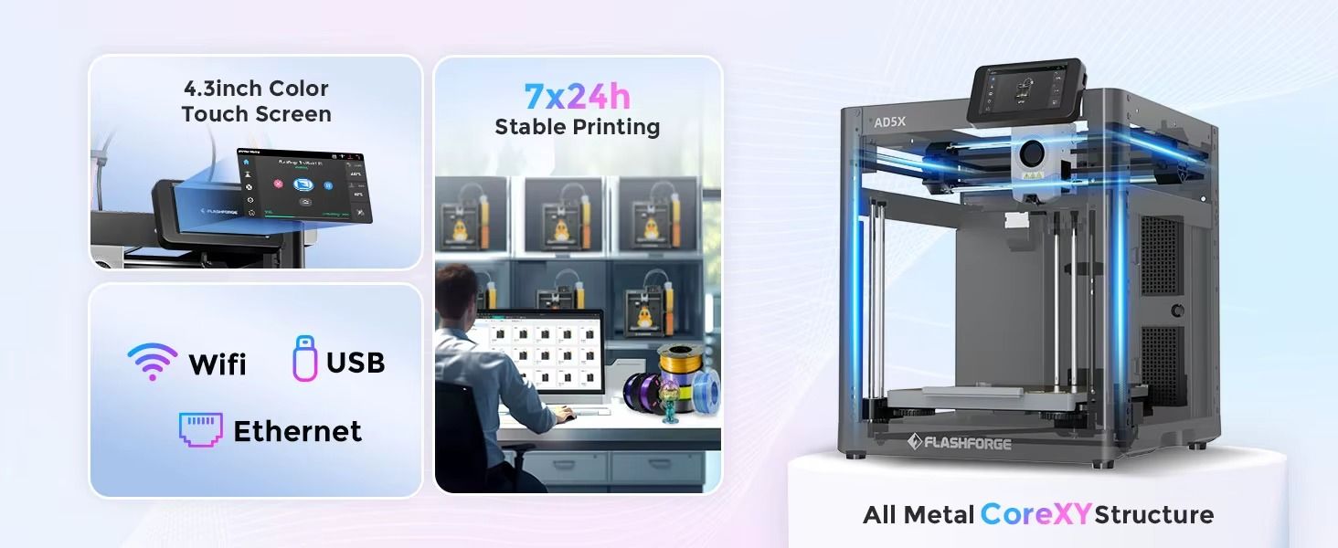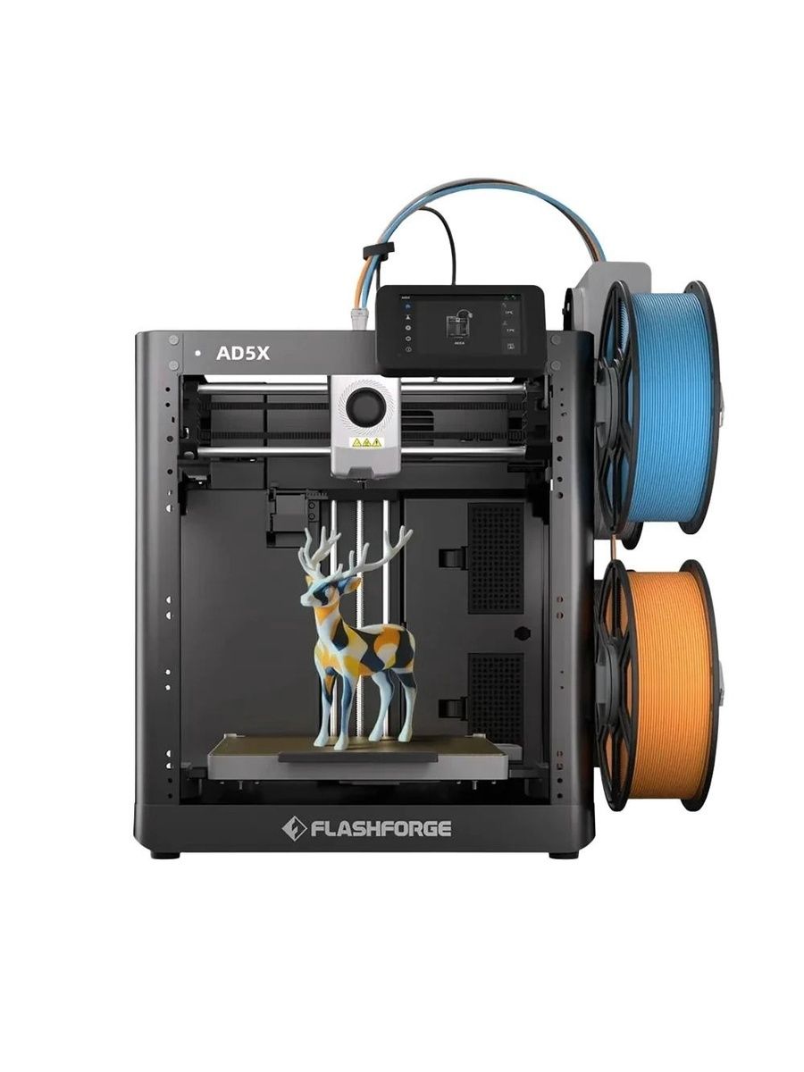 Flashforge AD5X – это домашний 3D-принтер с многоцветной печатью(до 4х катушкек одновременно), созданный для сложных проектов, профессионального прототипирования и производства деталей с высоким уровнем детализации.